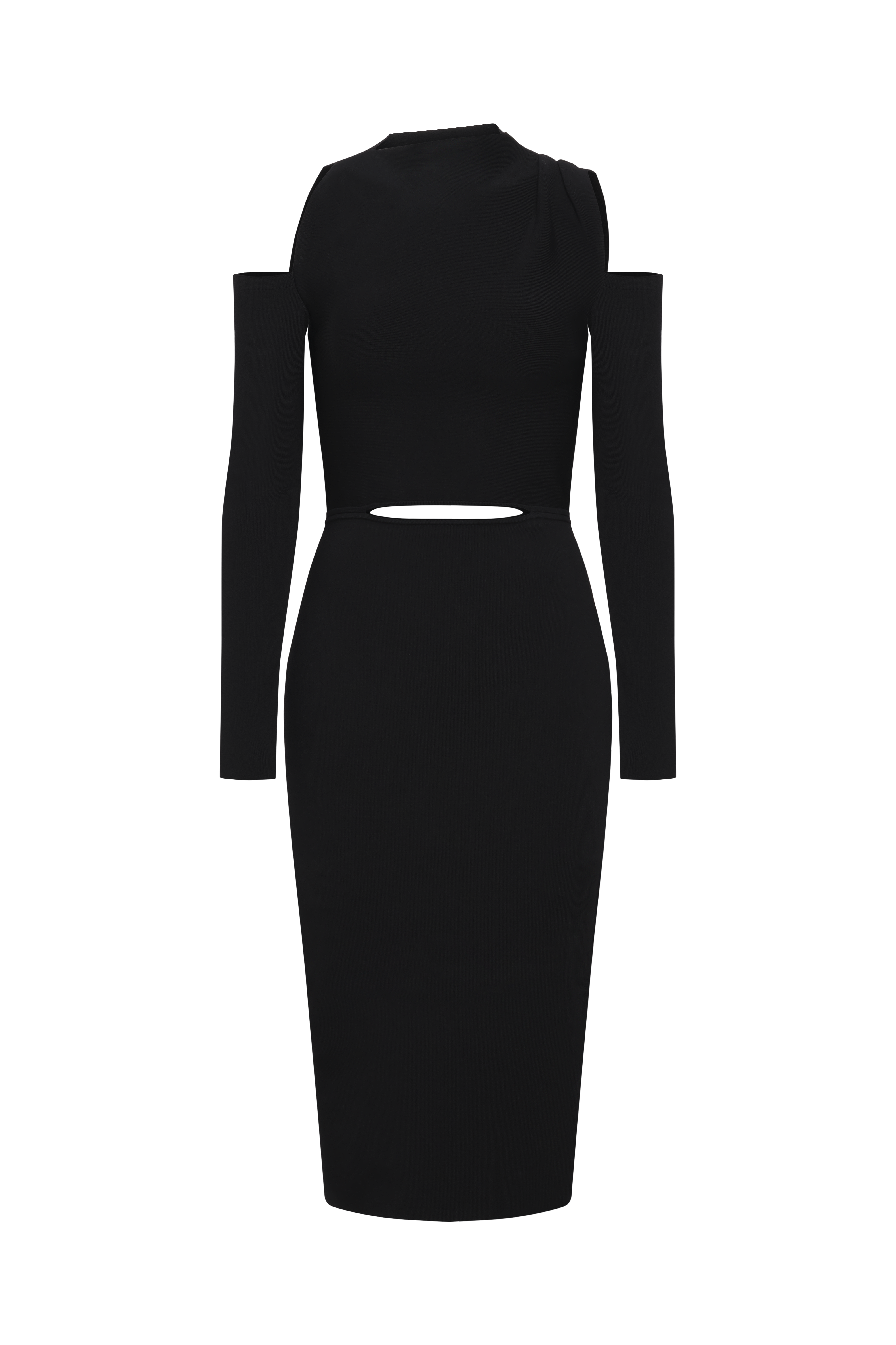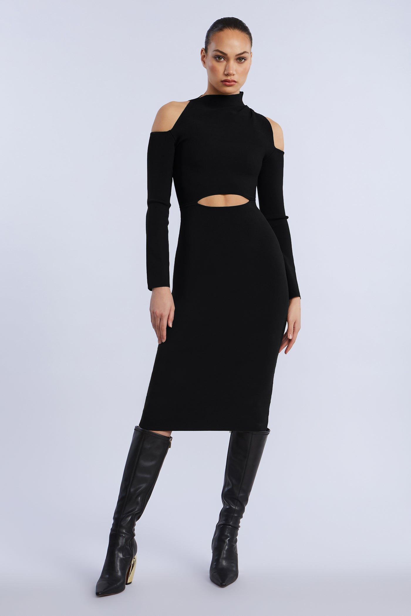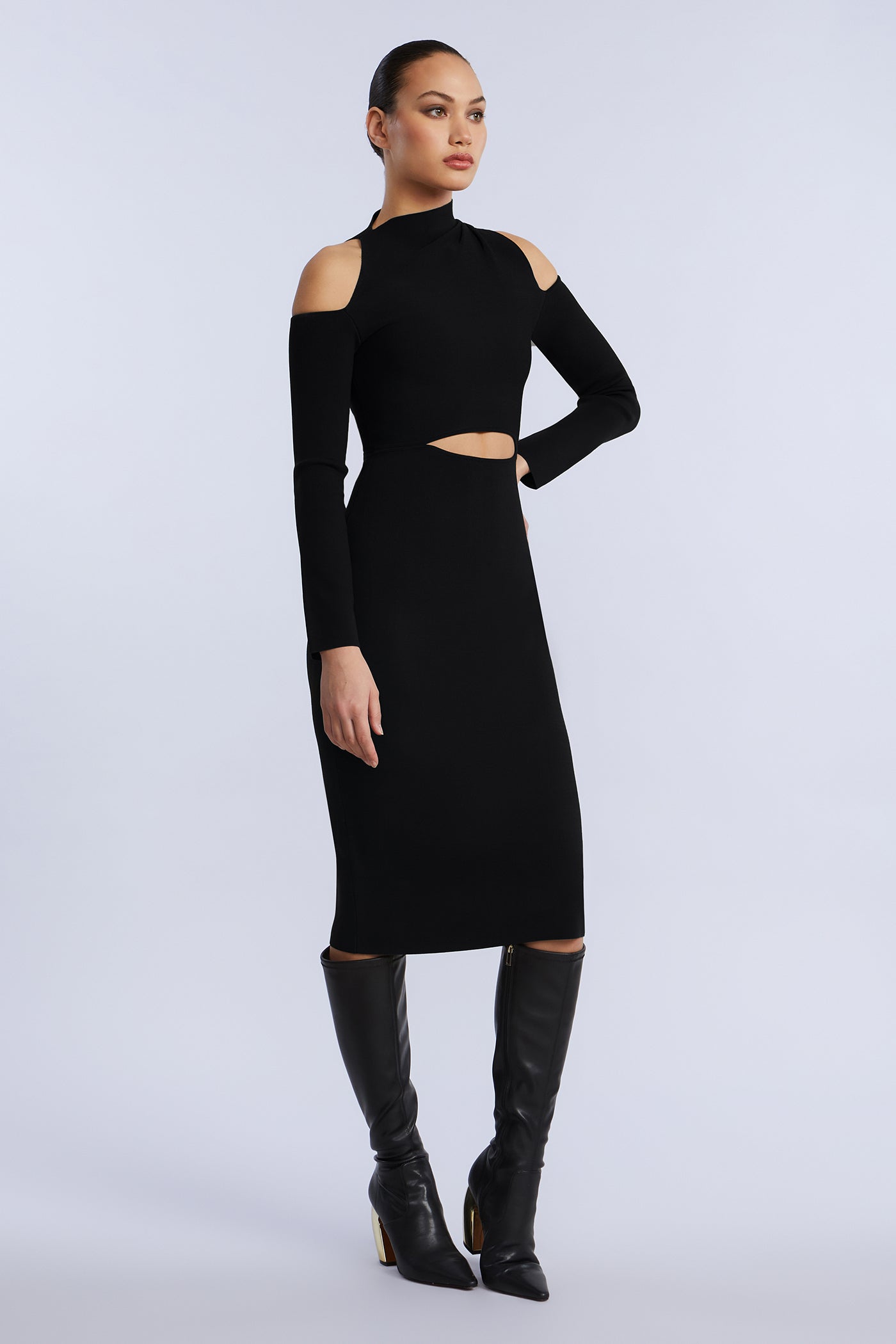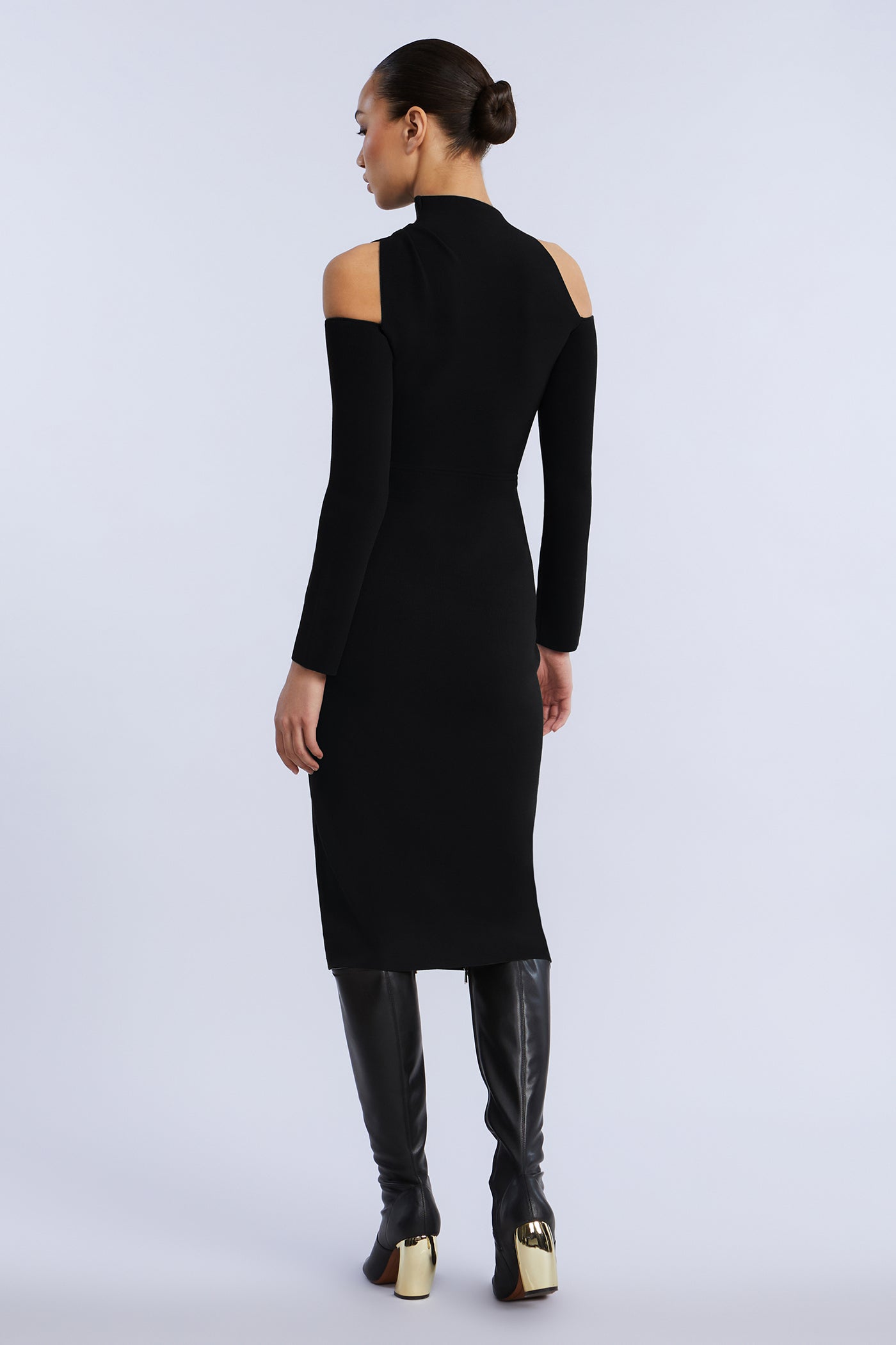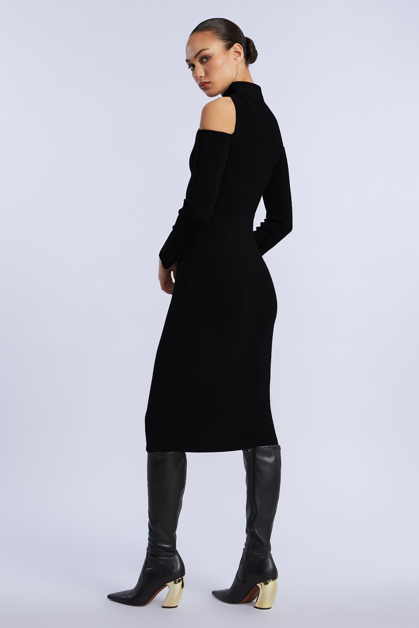 Sleek midi dress in structured knit jersey with sharp cutout detailing at the waist. Framed by cold shoulder sleeves and a modern high neckline. Finished with a concealed back zipper for a clean, body-hugging fit.