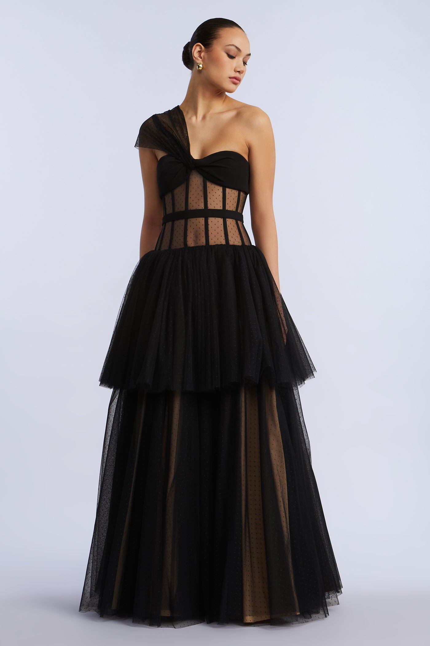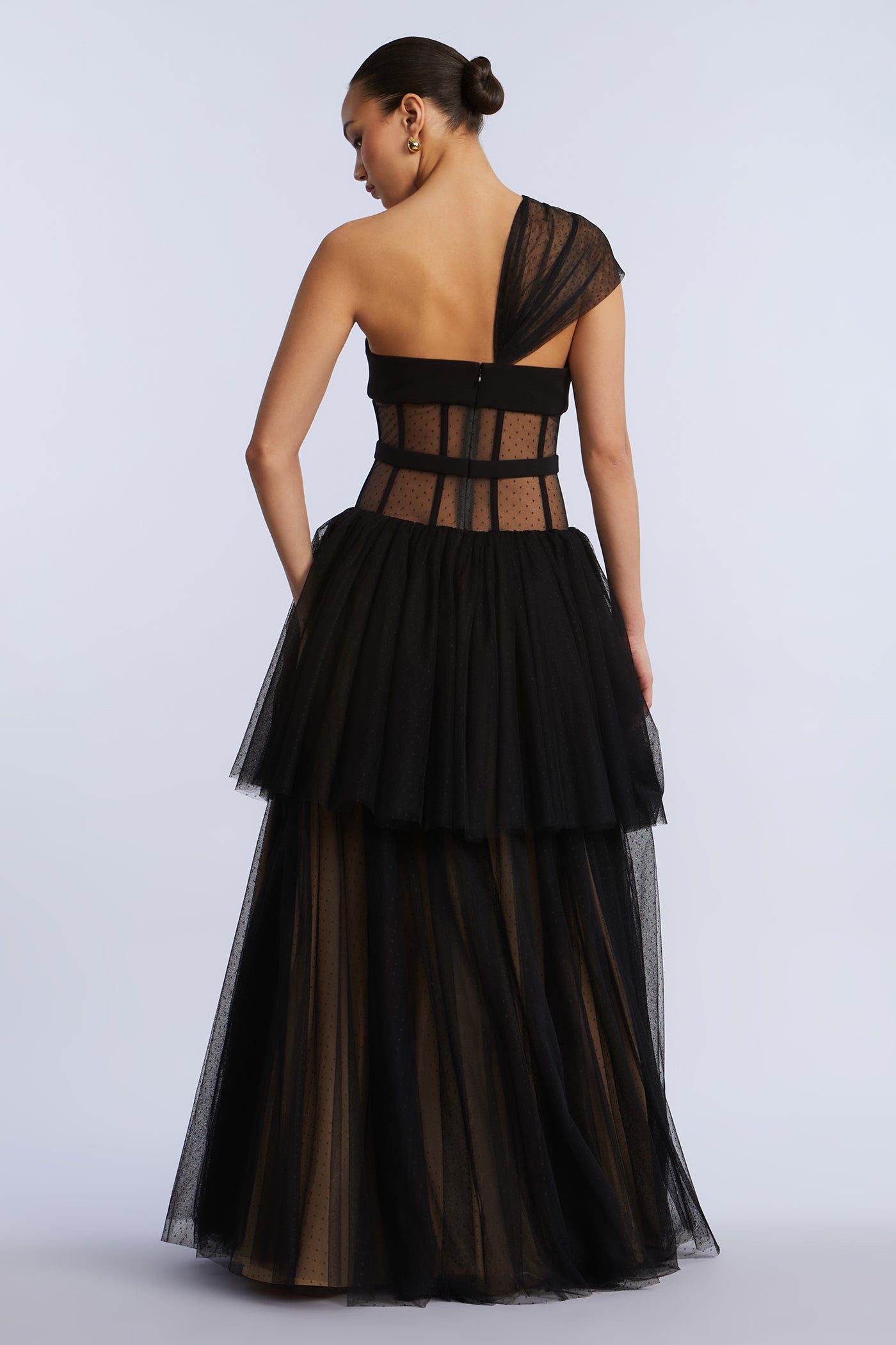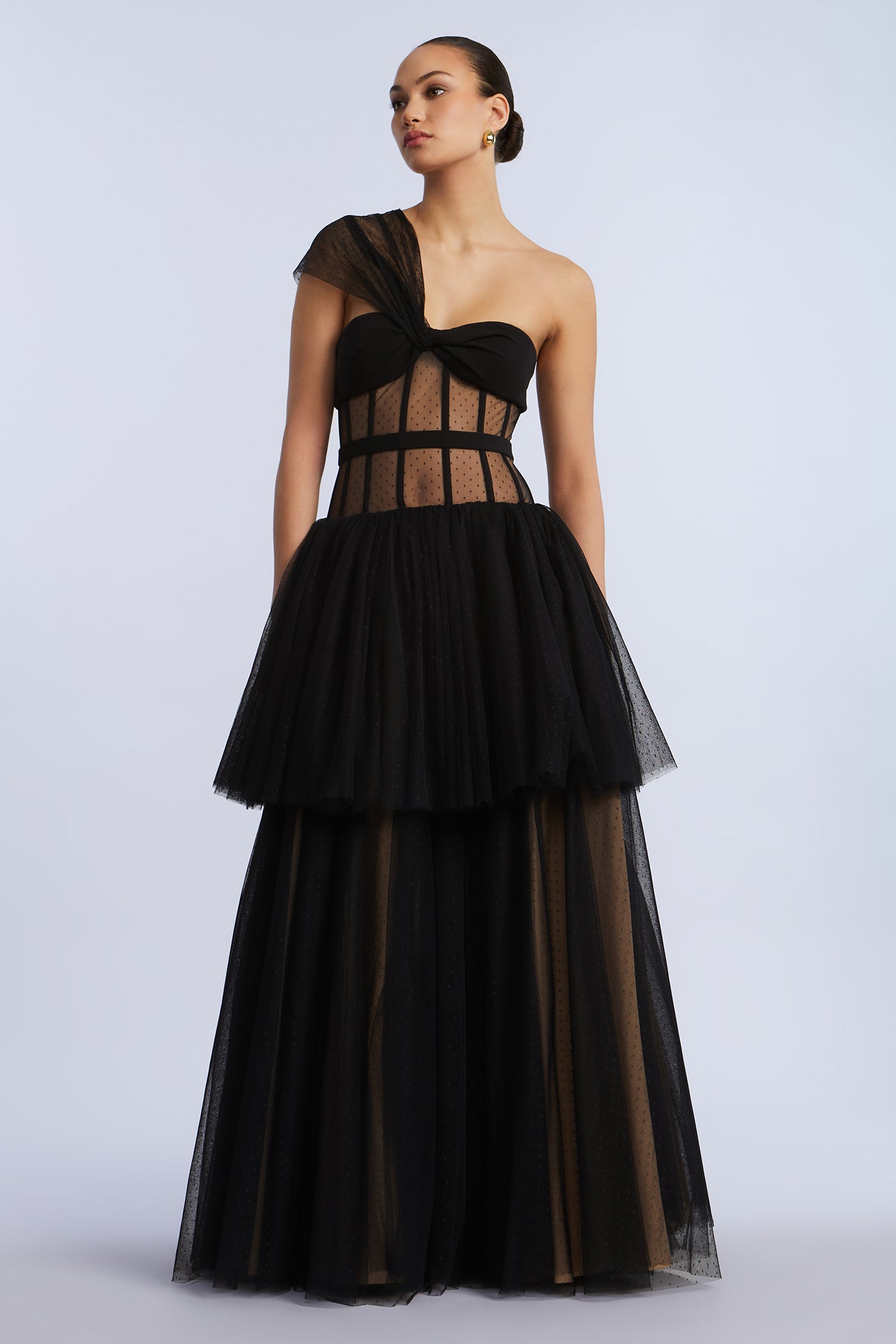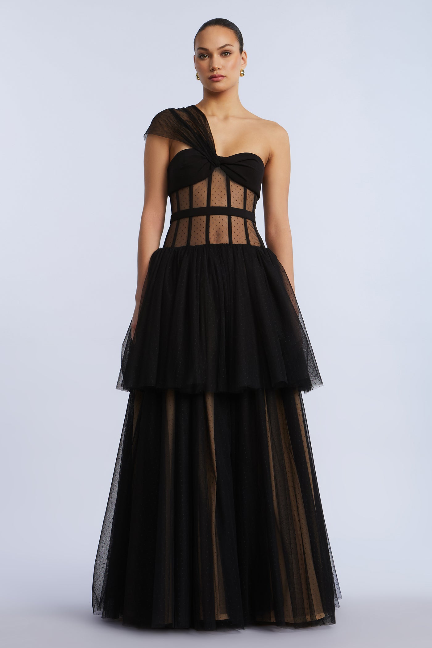 Sheer dotted tulle one-shoulder gown with a sculpted bodice and tiered skirt. Framed with velvet piping and finished with a soft drape that wraps across the bust. A standout for gala season, black tie affairs, or winter weddings.