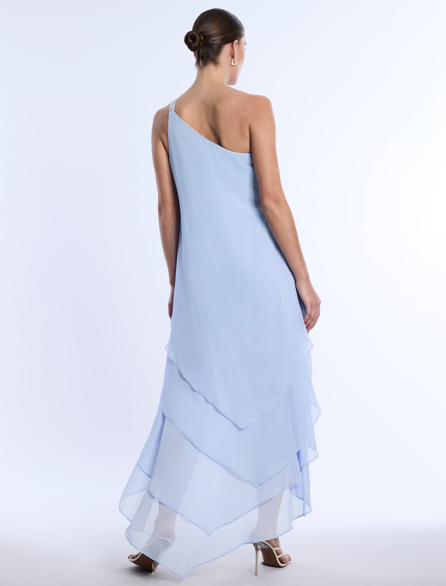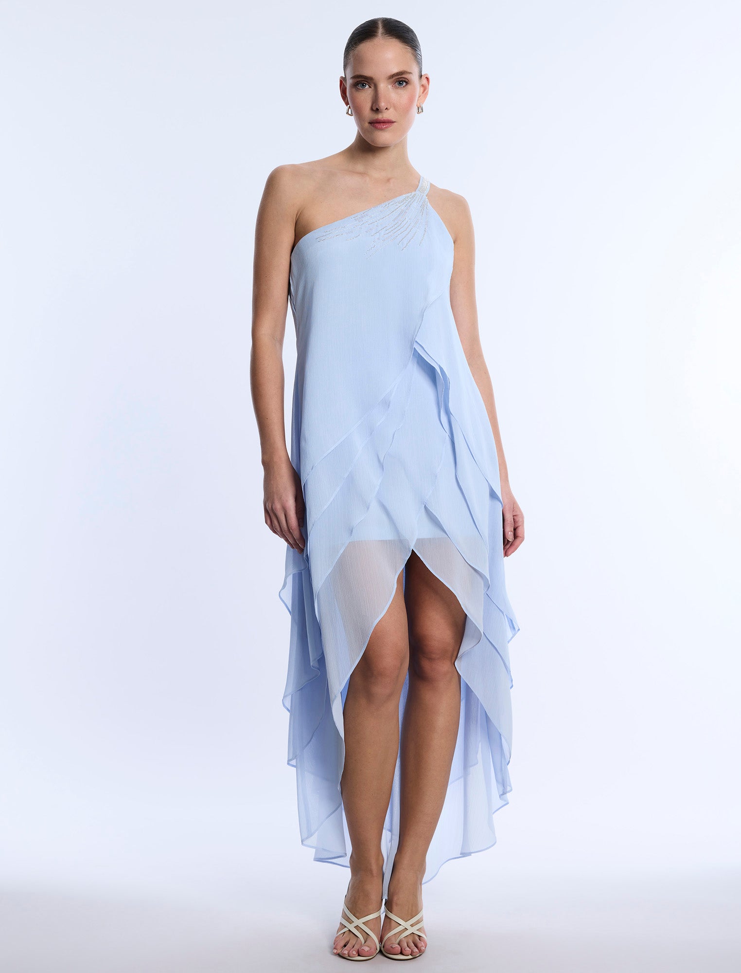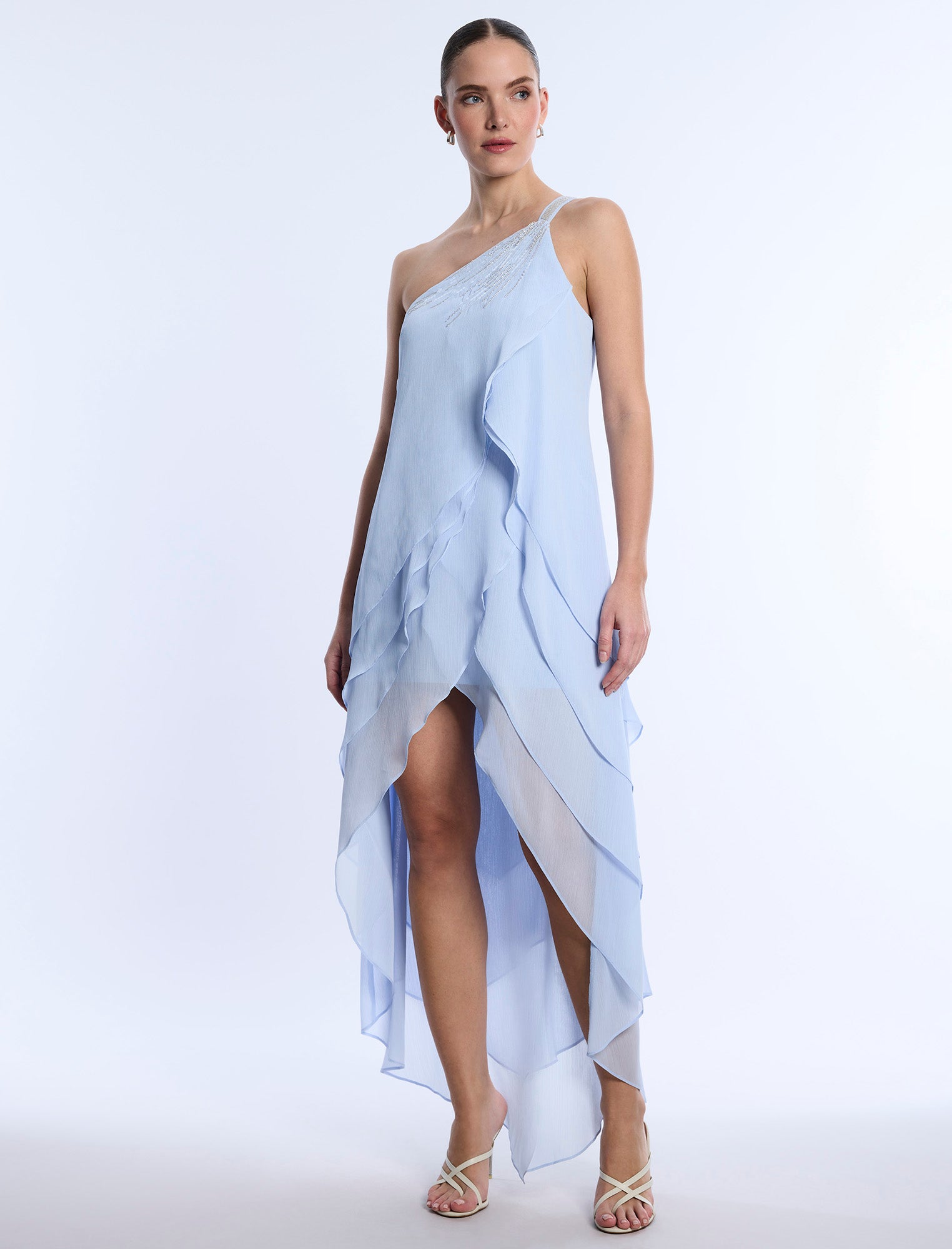Asymmetric high-low chiffon dress in a soft cloud blue, designed with cascading ruffles that flow with every step. Features subtle sequin embellishment along the neckline and a fluid one-shoulder silhouette. A dreamy pick for rehearsal dinners, summer soirées, or rooftop celebrations.