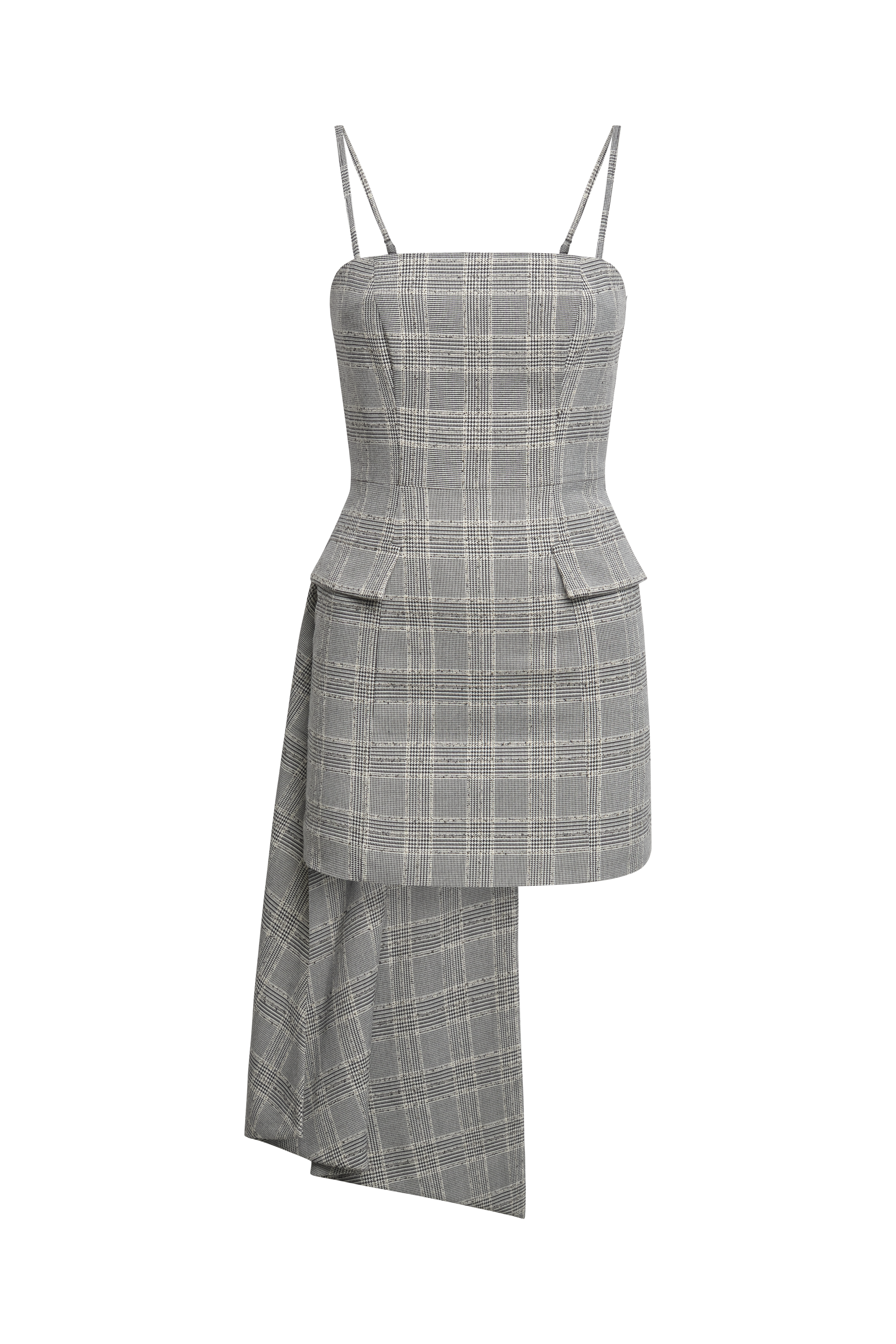 Tailored mini dress in a grey plaid suiting with asymmetric drape detail at the hem. Finished with flap pockets and a square neckline. Concealed back zipper closure.