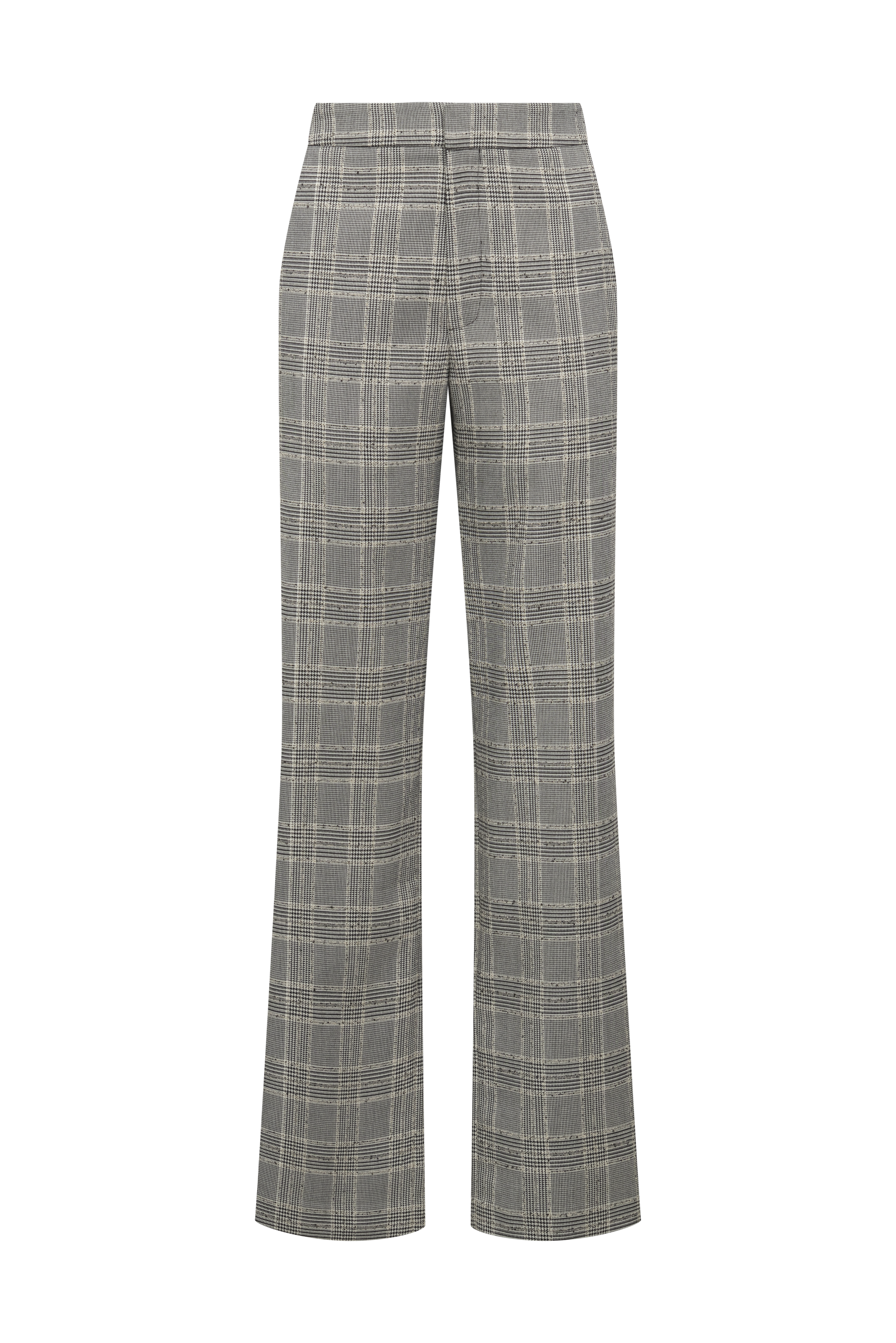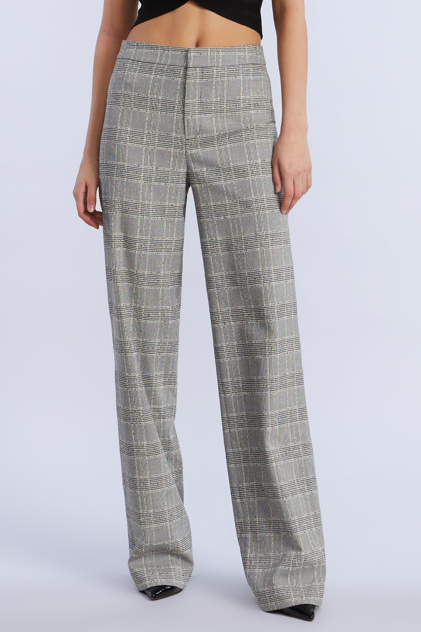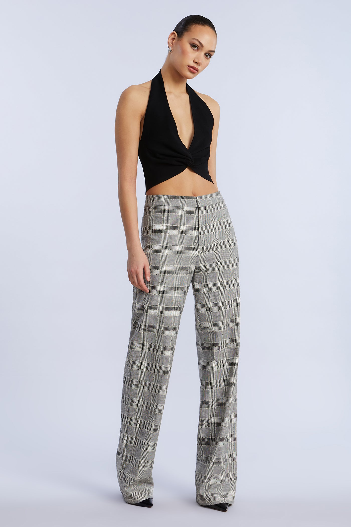 Plaid glen check trouser with a clean waistband and hook-and-bar closure. Tailored with subtle darting and pressed front creases for a sharp finish. An easy desk-to-dinner piece—pair it with the matching top or a sleek halter.