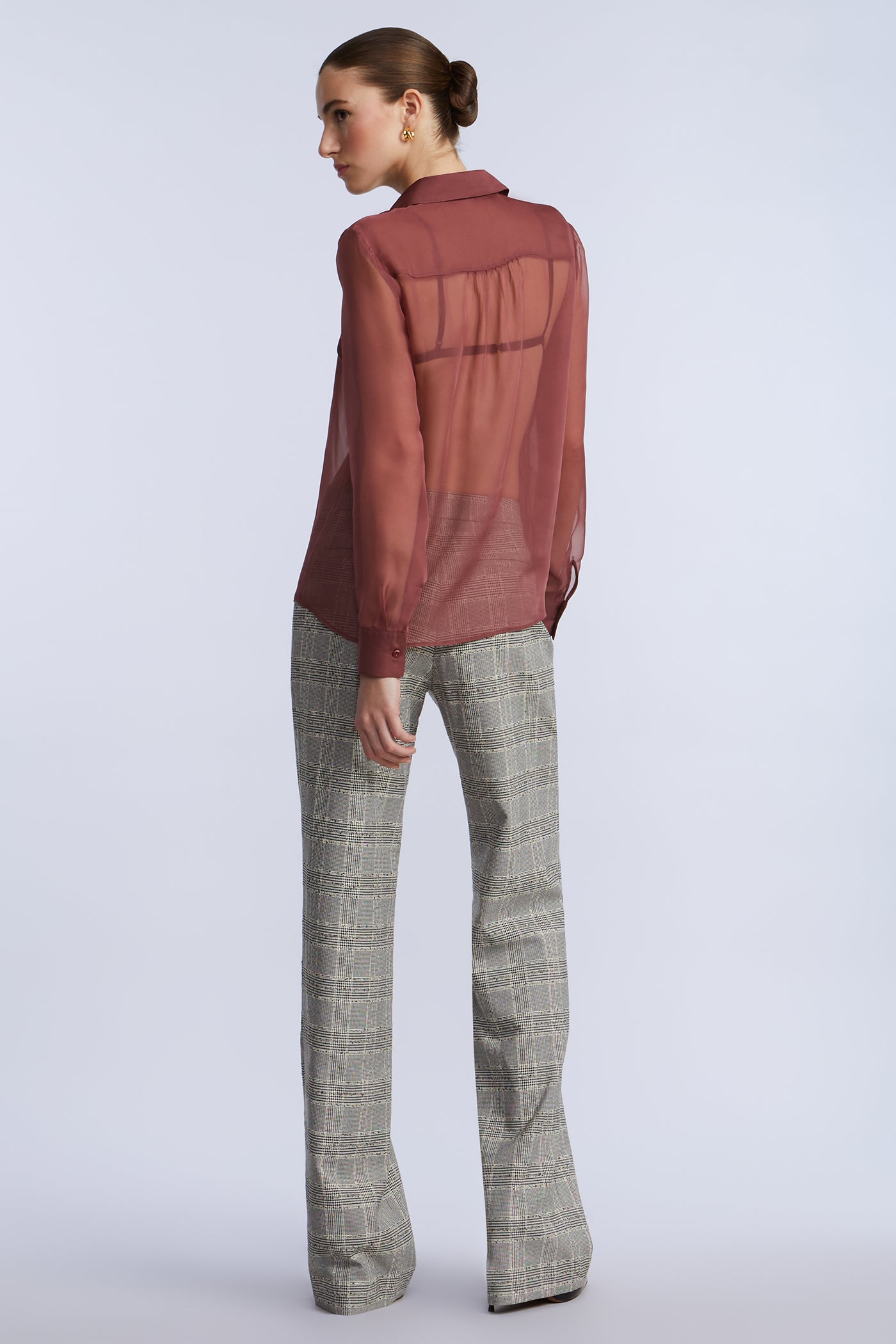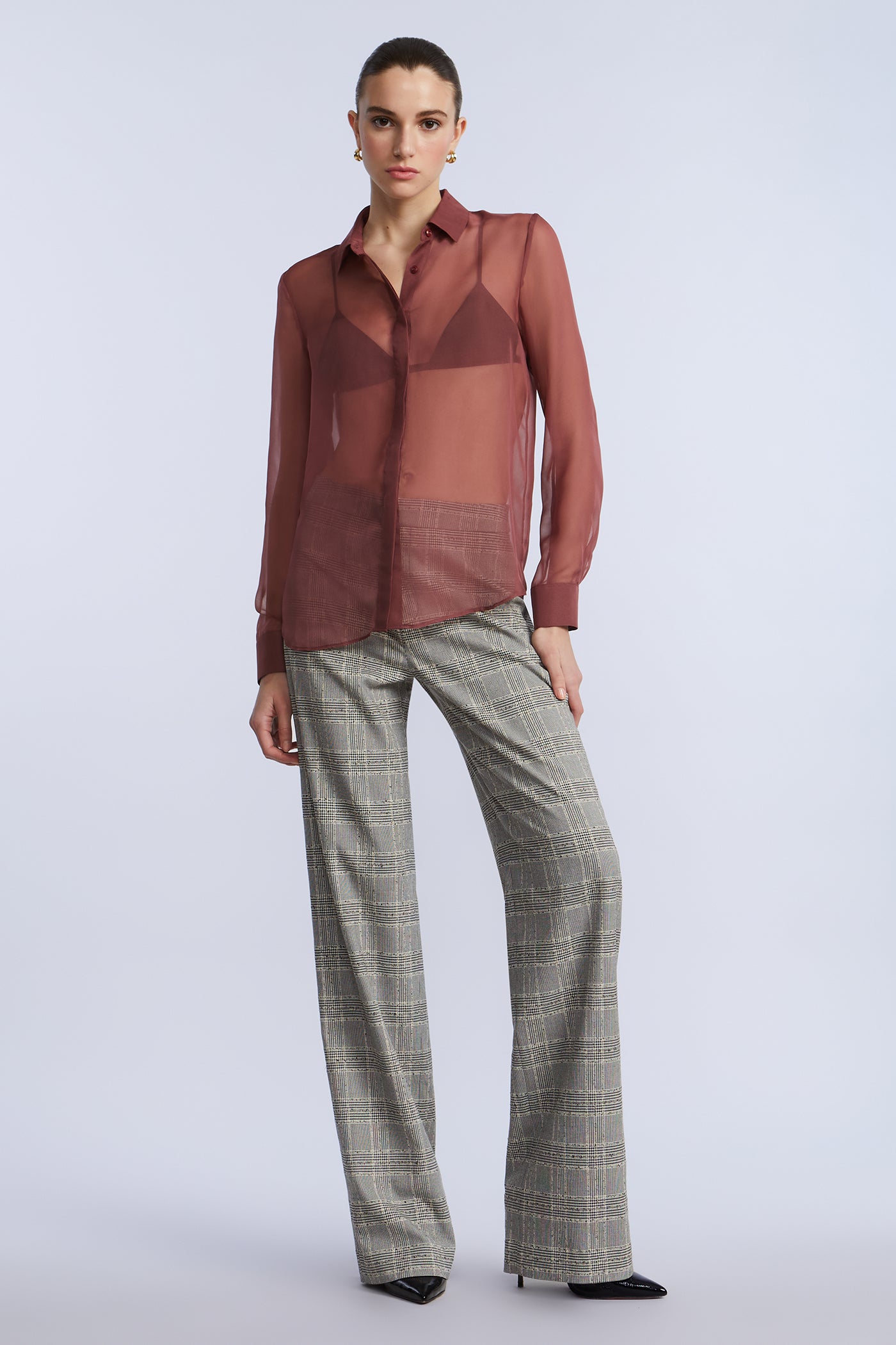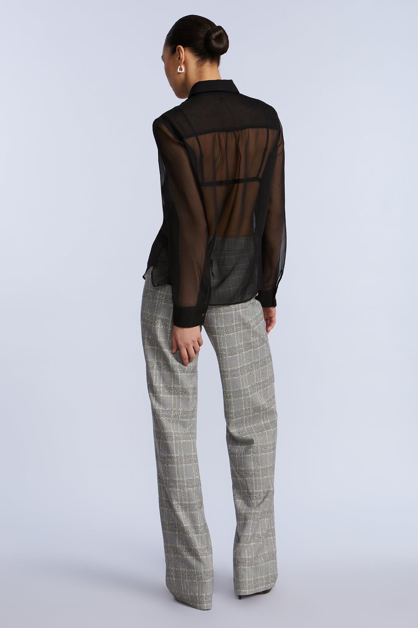 Plaid glen check trouser with a clean waistband and hook-and-bar closure. Tailored with subtle darting and pressed front creases for a sharp finish. An easy desk-to-dinner piece—pair it with the matching top or a sleek halter.