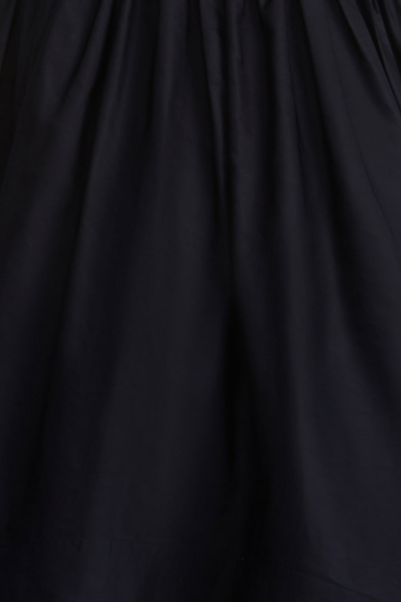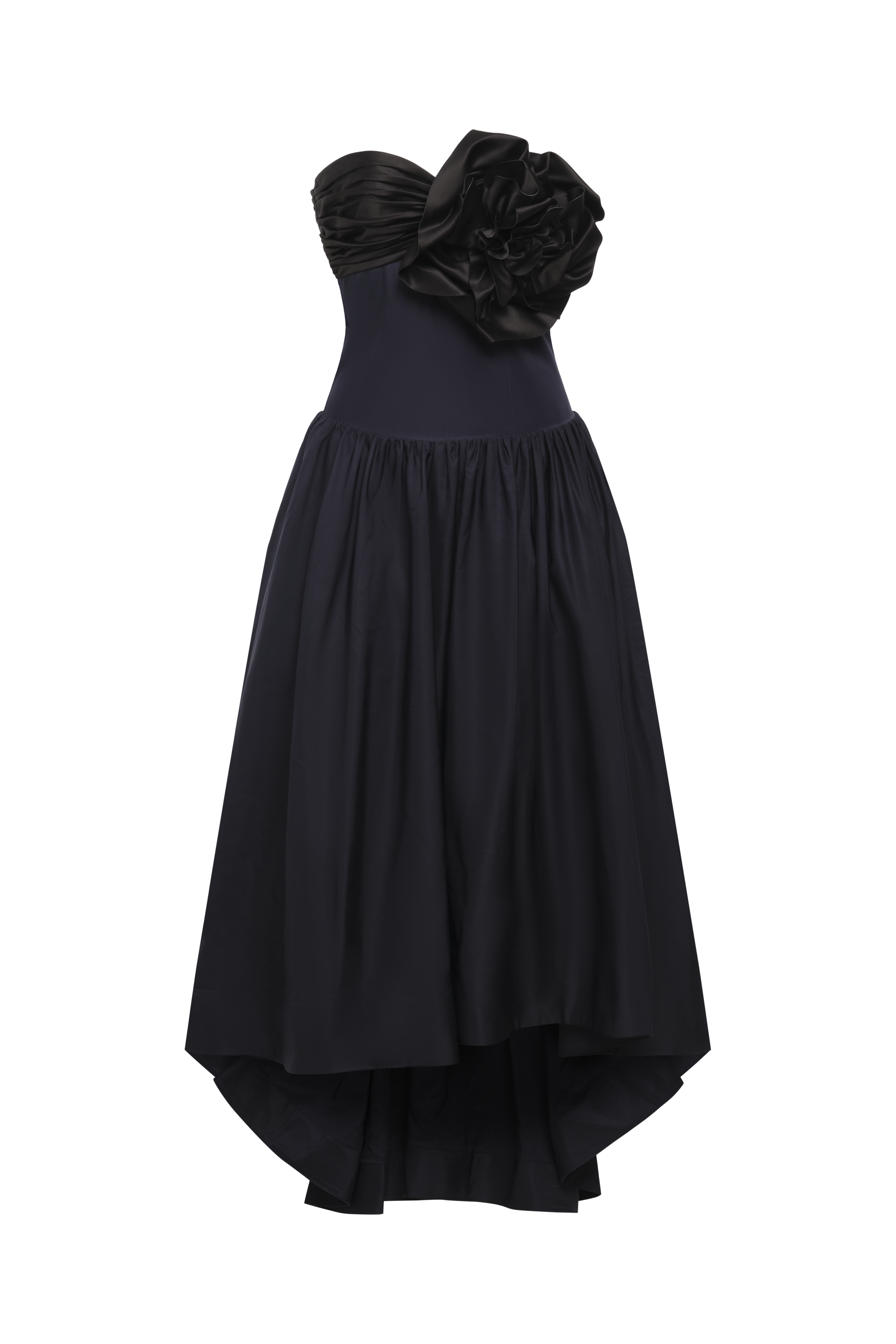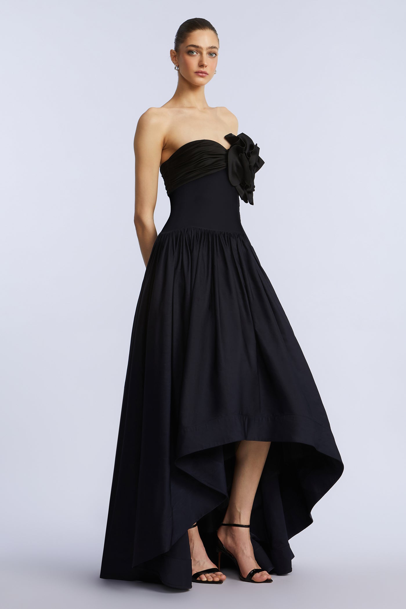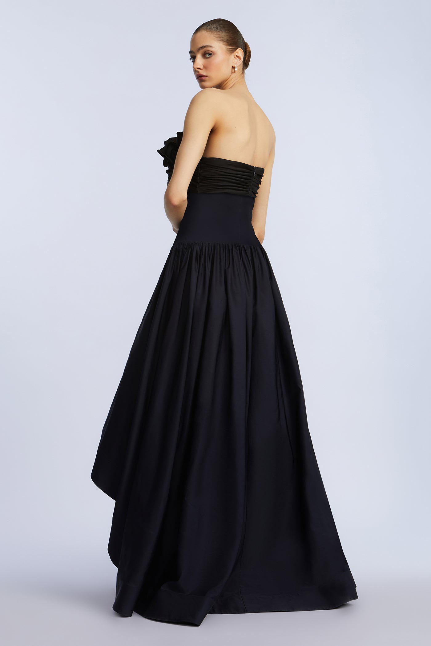 Taffeta gown with a ruched strapless bodice and oversized floral appliqué. The smocked waist falls into a dramatic high-low hem with a full gathered skirt. A bold silhouette for black-tie invites and formal receptions.