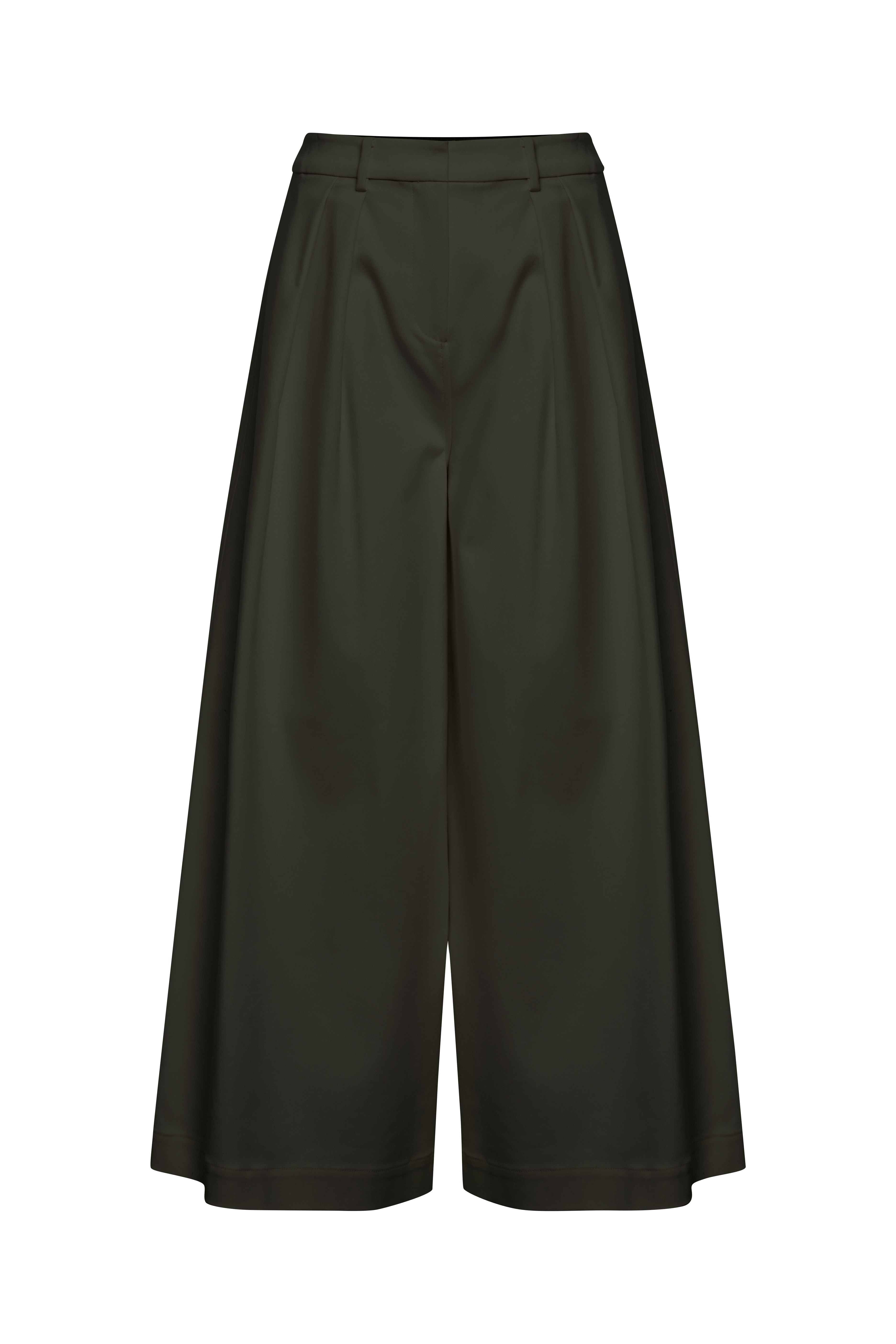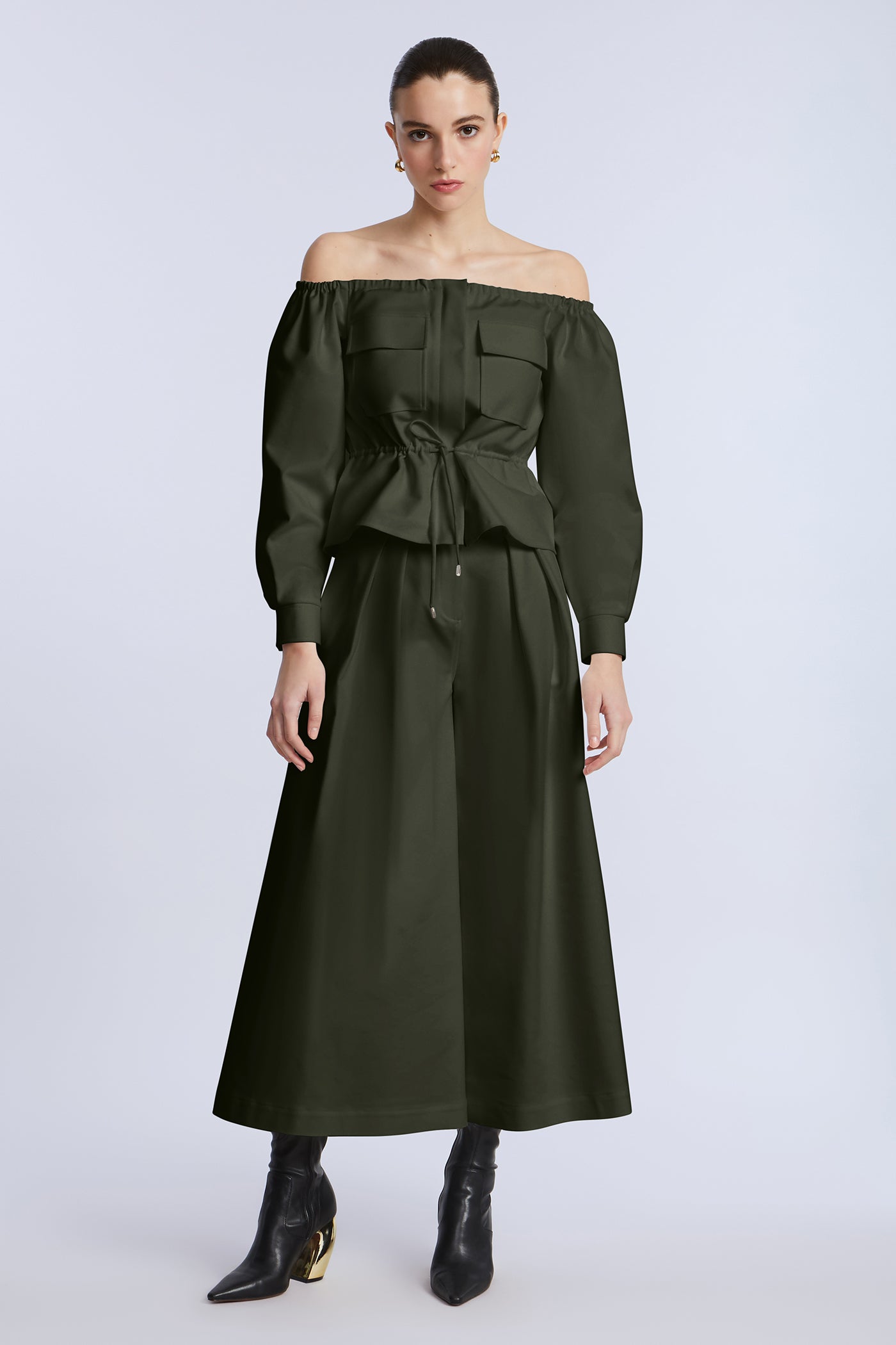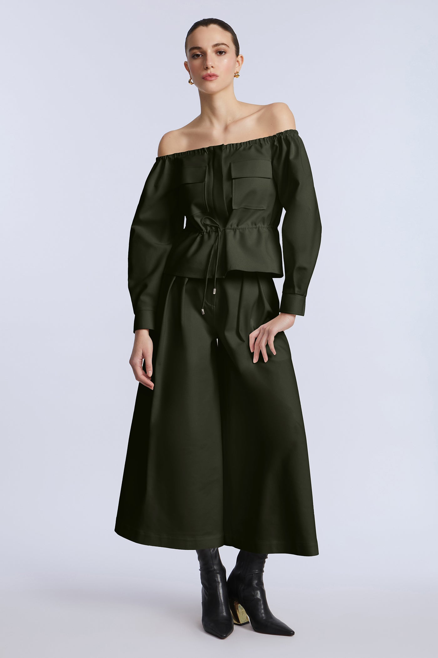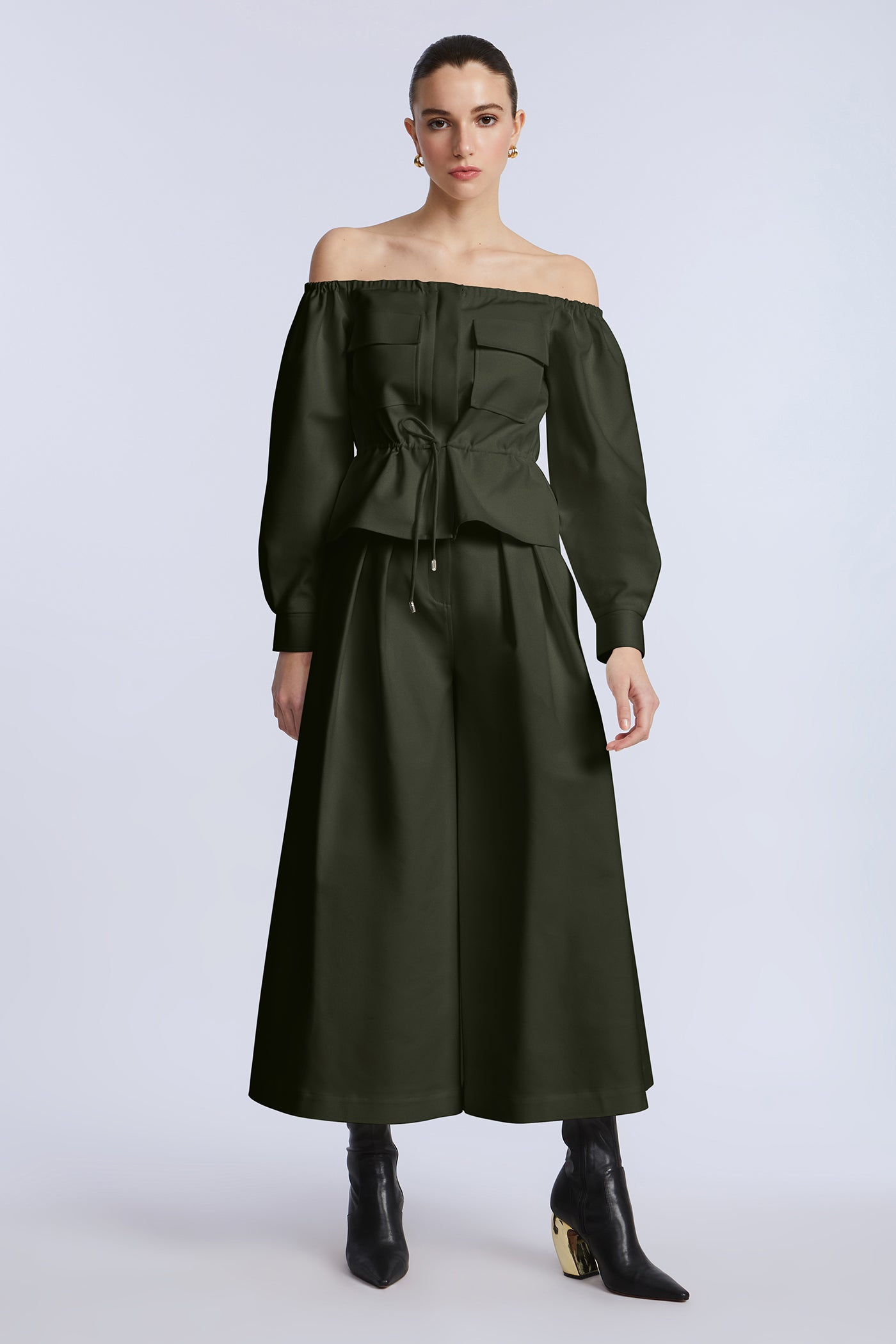 Wide-leg cropped pants in a rich olive green cotton sateen. Designed with pleated front detailing and a clean waistband for a sculpted finish. Add the matching top for a bold monochrome moment.