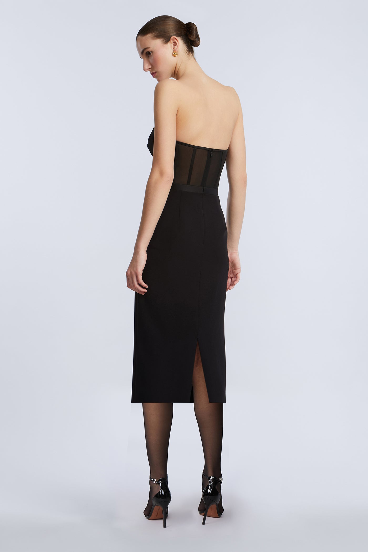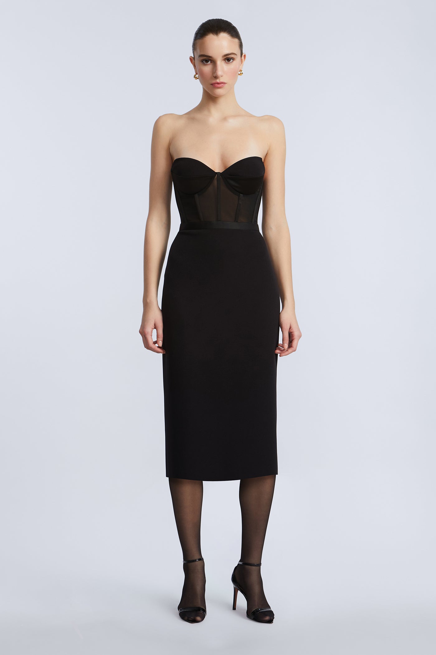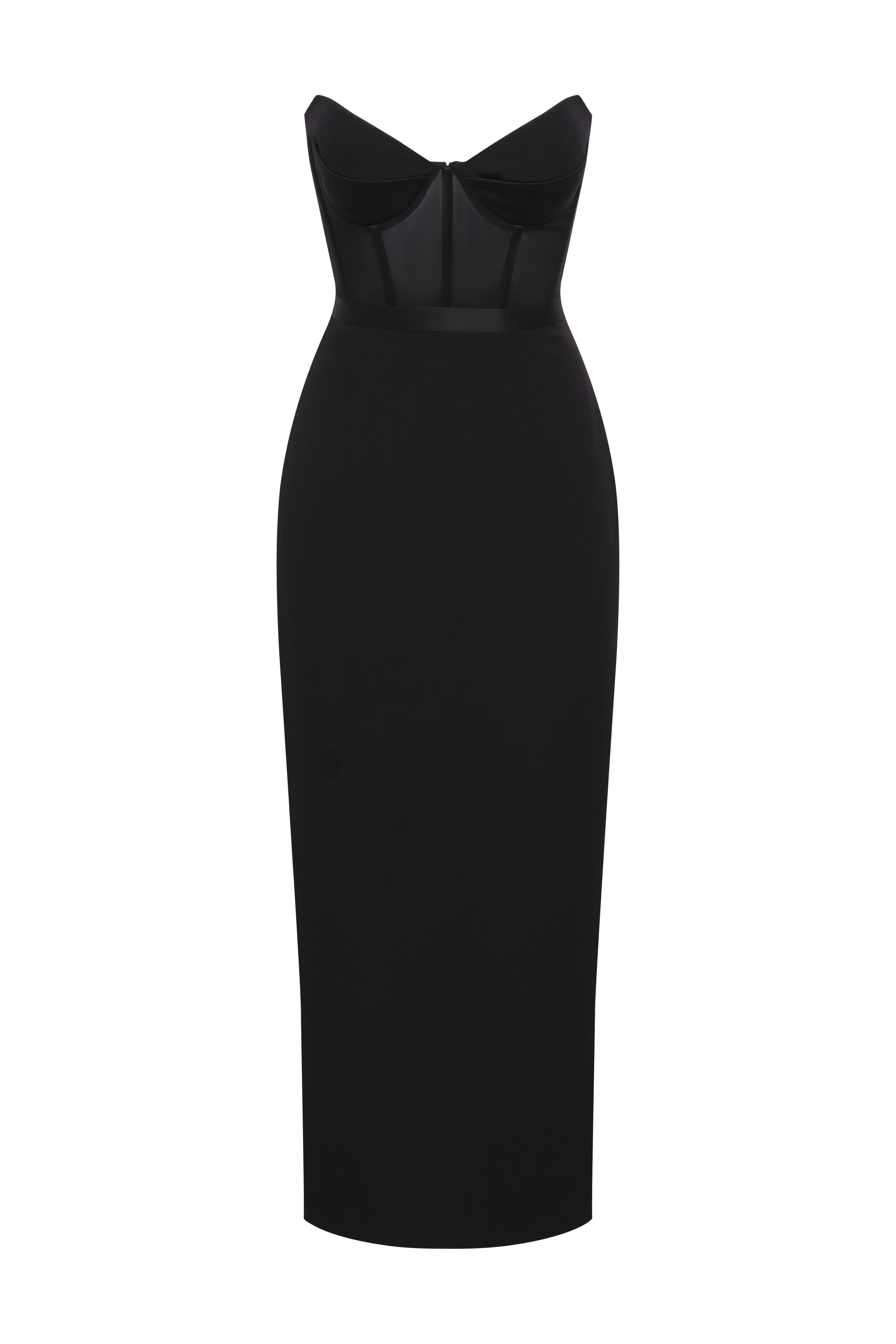 Strapless bustier dress with a sheer mesh bodice and sculpted cups. The pencil skirt falls below the knee for a sleek, elongated finish. Complete with a concealed back zipper and back vent—your secret weapon for cocktail hours and beyond.