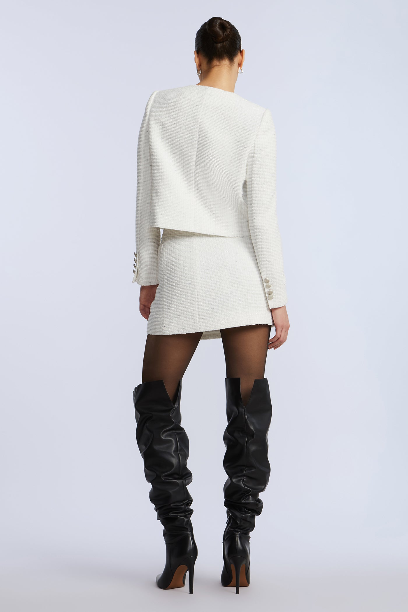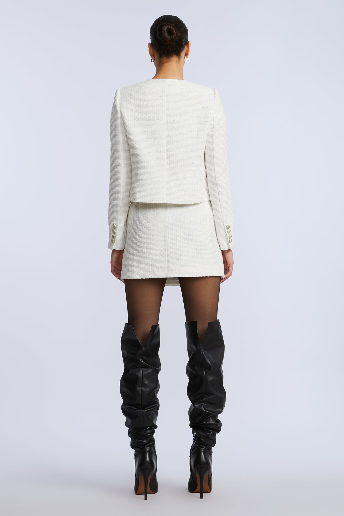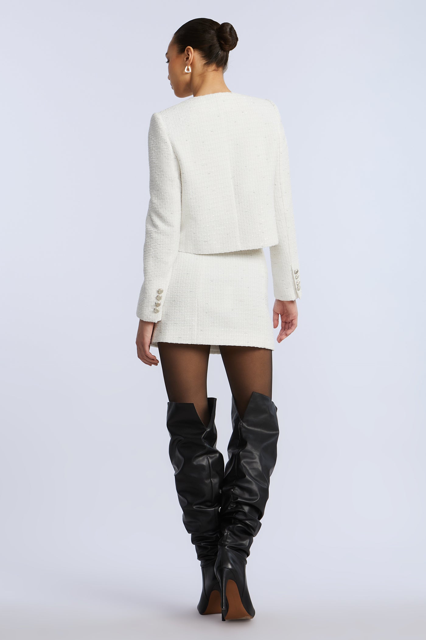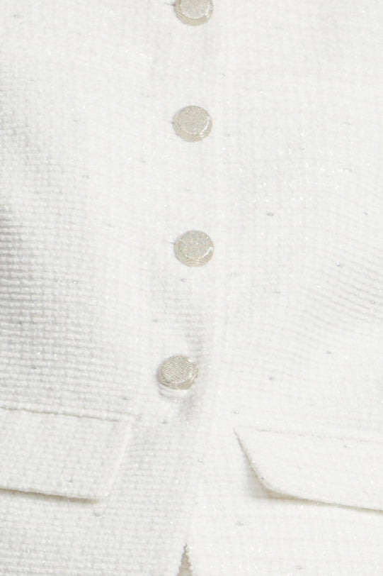 Cropped tweed jacket woven with subtle metallic thread for a soft shimmer. Finished with flap pockets, a clean neckline, and oversized buttons for a polished, tailored look. Fully lined with a button-down front.