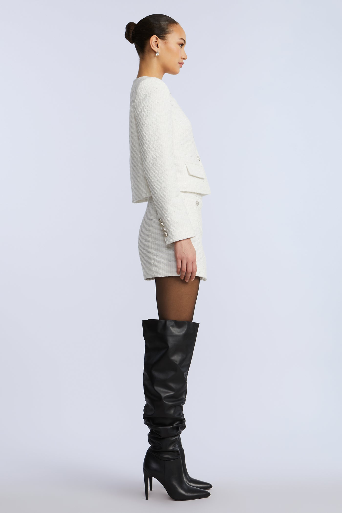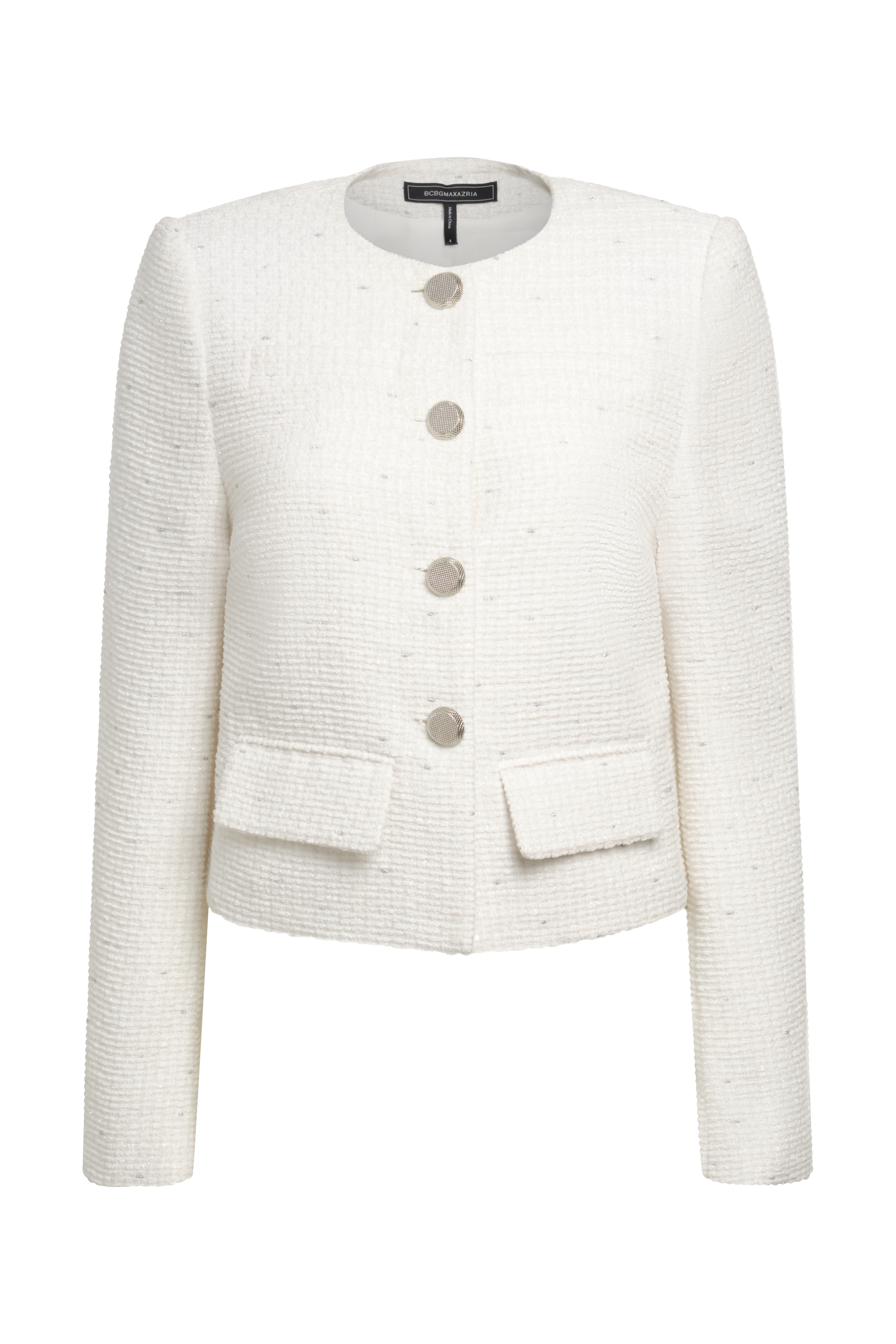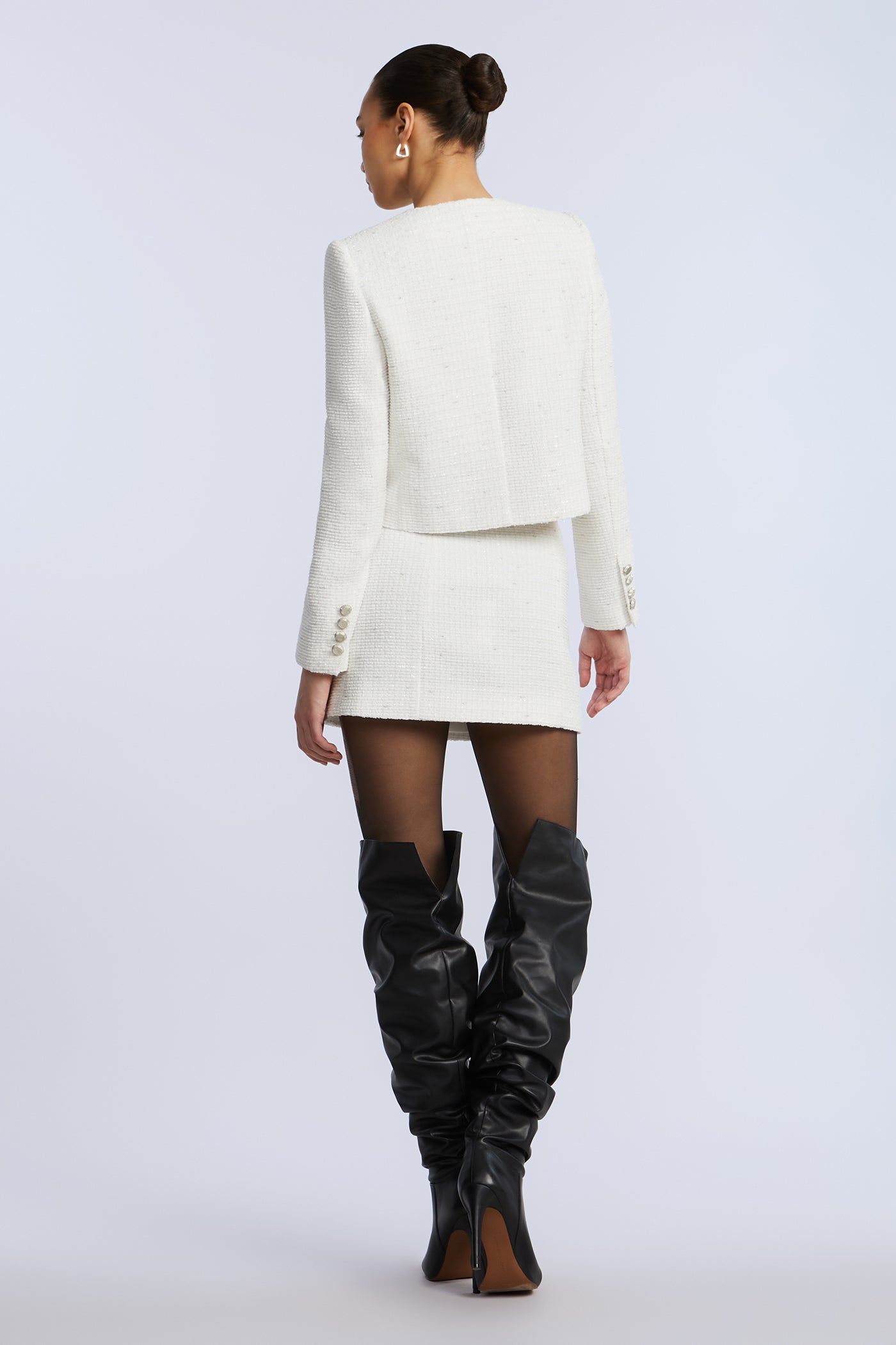 Cropped tweed jacket woven with subtle metallic thread for a soft shimmer. Finished with flap pockets, a clean neckline, and oversized buttons for a polished, tailored look. Fully lined with a button-down front.